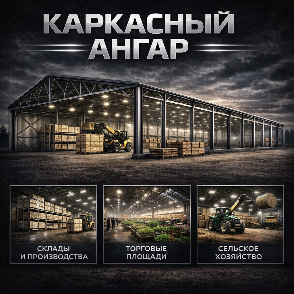 Каркасные ангары — это универсальные металлические здания, предназначенные для складских, производственных и коммерческих объектов. Конструкция на основе стального каркаса позволяет реализовывать большие пролёты без внутренних опор, устанавливать оборудование, кран-балки и инженерные системы.